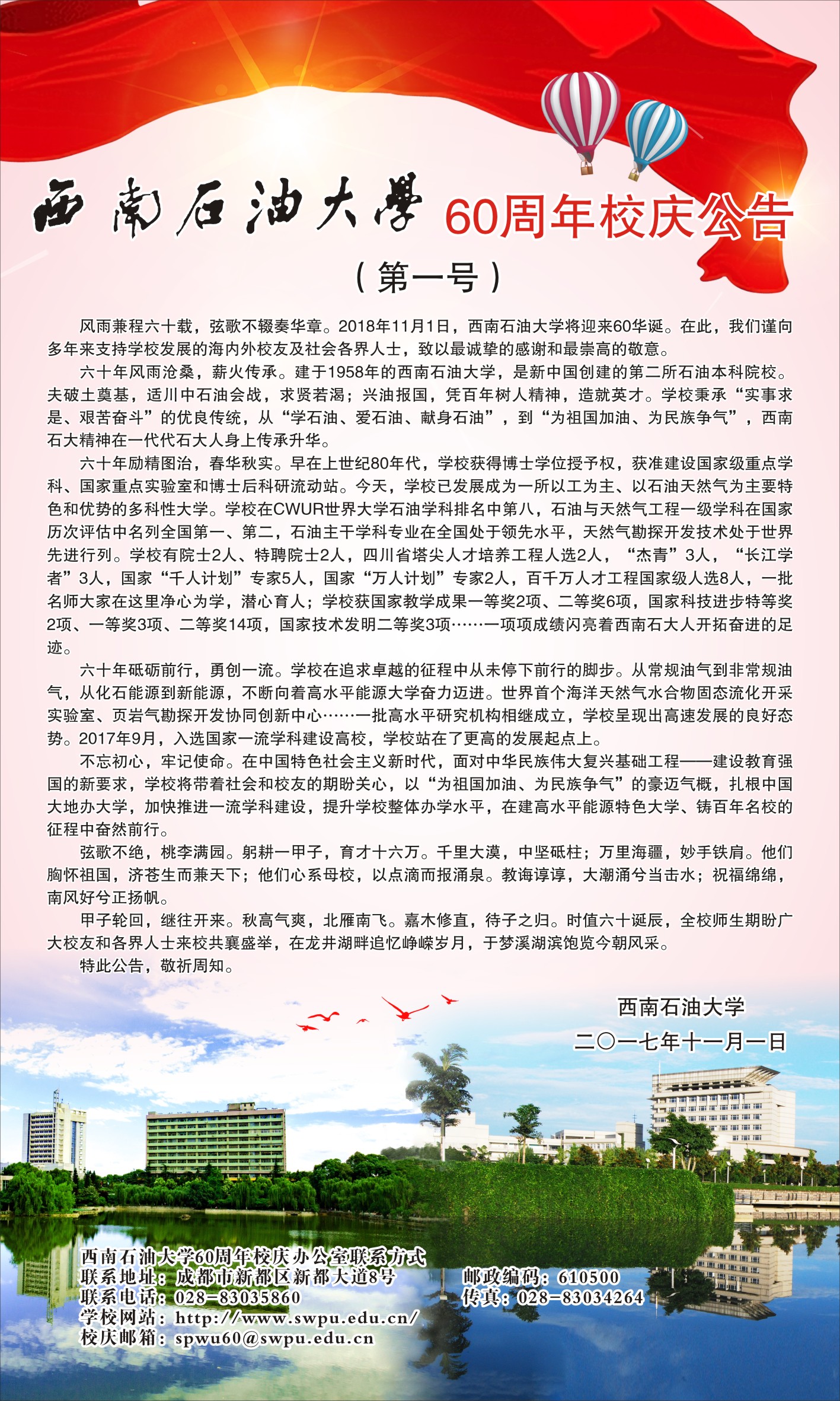 西南石油大學(xué)60周年校慶公告(第一號)