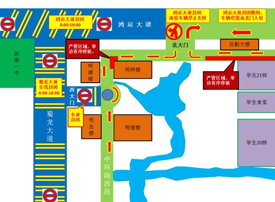 接新都區(qū)大學(xué)中專招生委員會(huì)通知:為給新都一中(校西大門外)考點(diǎn)高考、中考考生創(chuàng)造一個(gè)安全、暢通、有序的考試環(huán)境,考試期間:6月6日至9日(高考)、6月15日至17日(中考),交警部門將對(duì)考場(chǎng)區(qū)域進(jìn)行大范圍的交通管制(蜀龍大道北段全段、鴻運(yùn)大道西段至大件路口全線),禁止任何機(jī)動(dòng)車輛在管制區(qū)域通行。同時(shí),要求我校在考試期間關(guān)閉學(xué)校西大門機(jī)動(dòng)車通道,以配合考試區(qū)域交通管制工作。