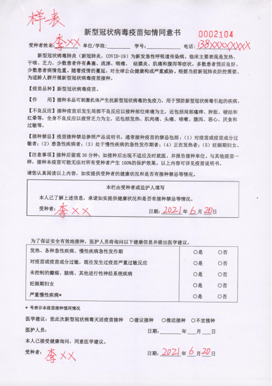 學校將于6月20日(本周日)上午10點在體育館接種第二針新冠疫苗,為提高接種現(xiàn)場的速度,凡5月30日(含5月30日)前已接種第一針新冠病毒疫苗的離退休教職工,請在6月18日下午5點30分前到離退休處辦公室領(lǐng)取接種同意書,并提前填寫好,于6月20日(本周日)上午10點攜帶同意書前往體育館接種。校醫(yī)院也將發(fā)短信通知大家接種時間。已接種第二針的請忽略本通知。