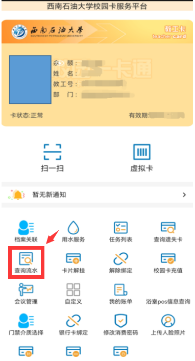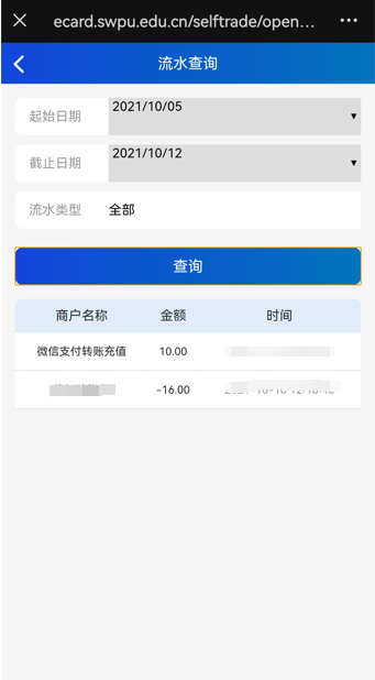 2.查詢消費(fèi)清單:在西南石油大學(xué)校園卡服務(wù)平臺(tái)界面,選擇“查詢流水”,可以查詢個(gè)人校園卡的詳細(xì)消費(fèi)清單。