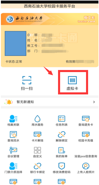 1.微信虛擬卡消費(fèi):在西南石油大學(xué)校園卡服務(wù)平臺(tái)界面,選擇“虛擬卡”,開啟付款碼(可手動(dòng)刷新付款碼)。在食堂等消費(fèi)機(jī)器的掃碼處掃碼消費(fèi)即可。