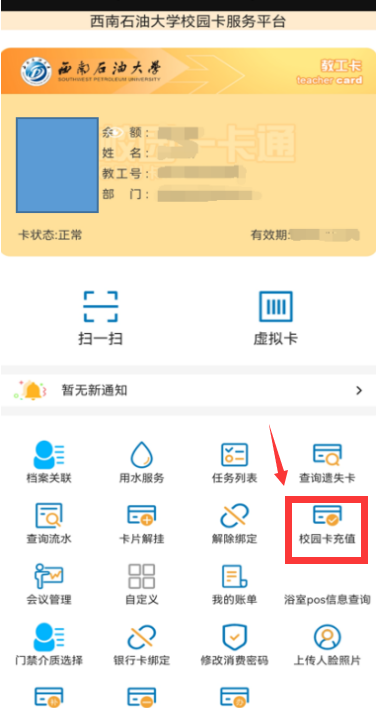 4.進(jìn)入西南石油大學(xué)校園卡服務(wù)平臺(tái),能查看校園虛擬卡的基本信息,選擇“校園卡充值”即可對校園卡進(jìn)行在線充值。