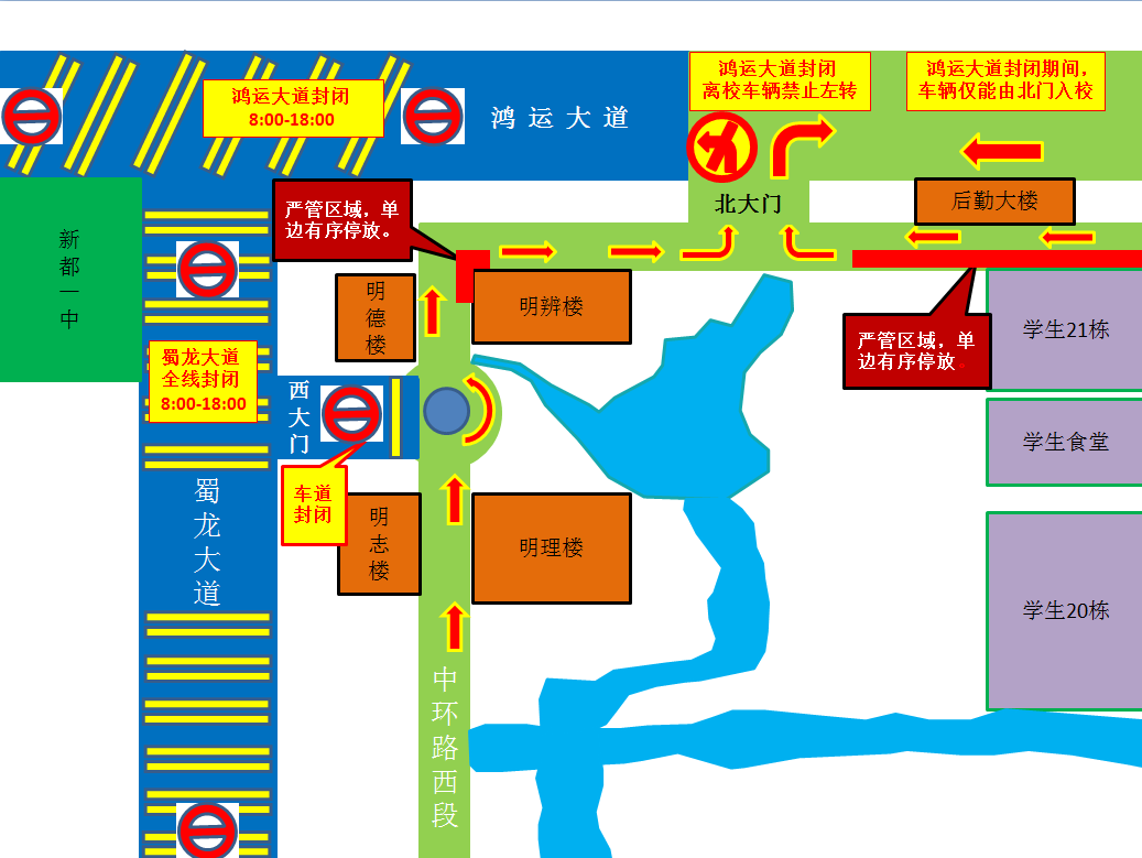 接新都區(qū)大學(xué)中專招生委員會(huì)通知:2023年高考定于6月6日至9日、中考定于6月12日至14日在新都一中(學(xué)校西大門(mén)對(duì)面)考點(diǎn)進(jìn)行。為給參考學(xué)生創(chuàng)造一個(gè)安全、暢通、安靜、有序的考試環(huán)境,交警部門(mén)屆時(shí)將對(duì)考場(chǎng)周邊區(qū)域進(jìn)行大范圍的交通管制(蜀龍大道北段全段、鴻運(yùn)大道西段至大件路口全線),禁止任何機(jī)動(dòng)車(chē)輛在管制區(qū)域通行。同時(shí),要求我校在考試期間關(guān)閉學(xué)校西大門(mén)機(jī)動(dòng)車(chē)通道,以配合考試區(qū)域的交通管制工作,具體安排如下: