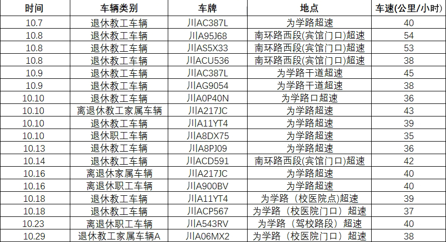接保衛處通報,按照學校工作安排,保衛處持續在校園內開展交通秩序專項整治活動。2023年10月監測到離退休職工及家屬車輛在校園內超速行駛違章情況(見下表)。