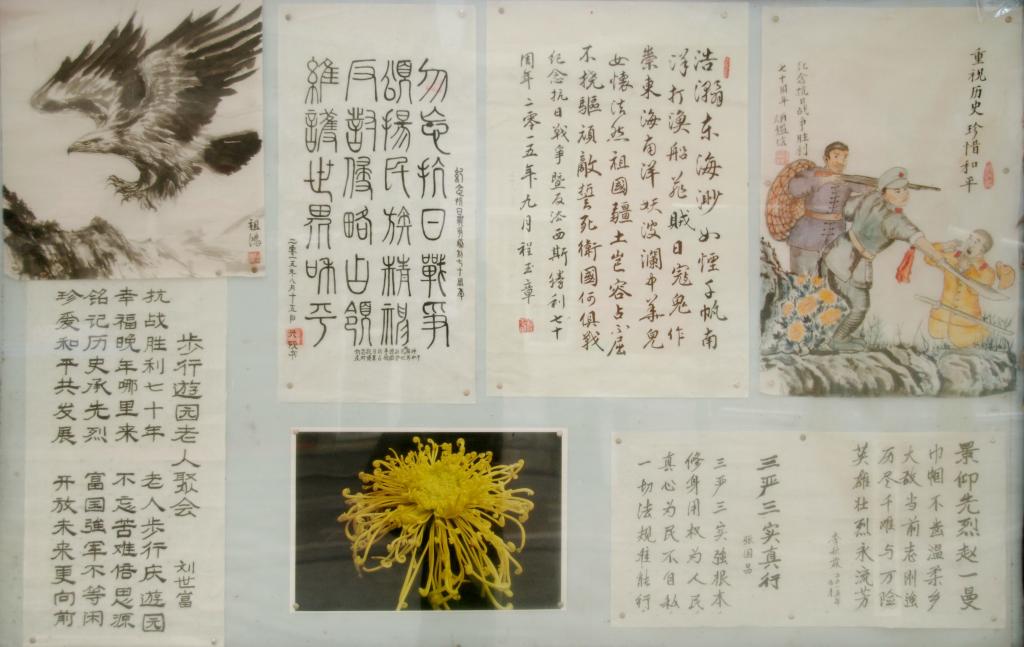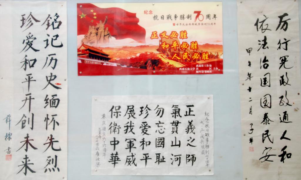 9月25日,我校離退休人員紀念抗戰勝利70周年詩書畫櫥窗在成都校區展出。本期櫥窗共展出老同志近期創作的以紀念抗戰勝利70周年等為主題的詩詞、書法、繪畫作品共計29幅。 本期專題櫥窗首次由西南石油大學離退休工作處、新都街道西南石油大學社區聯合主辦,西南石油大學頤年詩書畫社承辦。