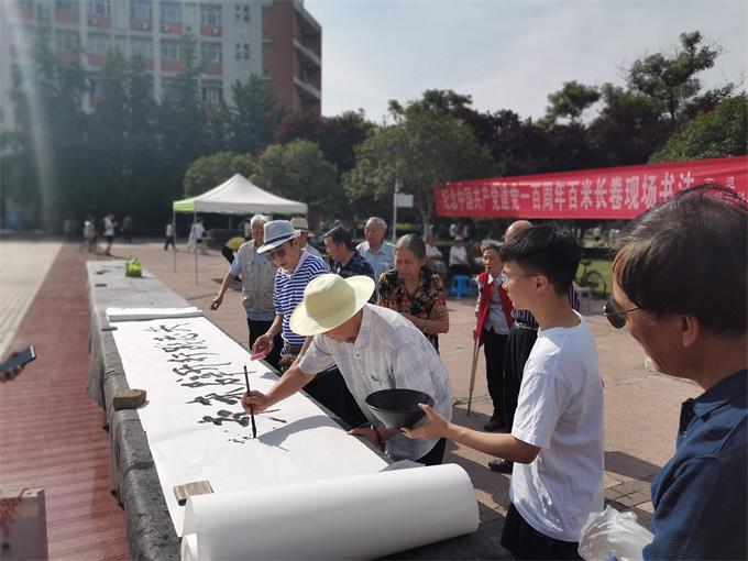 參加活動(dòng)的老師分別以行、楷、草、篆體等多種書(shū)法表現(xiàn)形式揮毫潑墨,直抒胸臆。90歲以上的崔汝梁、陶先德、劉炳鑒、孟識(shí)今、范錦臨等老先生迎著朝陽(yáng),飽蘸濃墨、首開(kāi)筆鋒,留下了“黨恩浩蕩”、“革命先鋒、建設(shè)楷模”、“矢志踐行、開(kāi)辟未來(lái)”等墨寶。其他老師也不懼烈日,依次留下墨寶。圍觀觀摩學(xué)習(xí)欣賞者也越老越多,不時(shí)還有學(xué)生和老師也提筆書(shū)寫(xiě)。百米長(zhǎng)卷書(shū)法字字句句深情表現(xiàn)出西南石油大學(xué)師生對(duì)黨的信任、愛(ài)戴、感恩之情,表達(dá)了大家永遠(yuǎn)聽(tīng)黨話(huà)、永遠(yuǎn)跟黨走的信心和決心。
