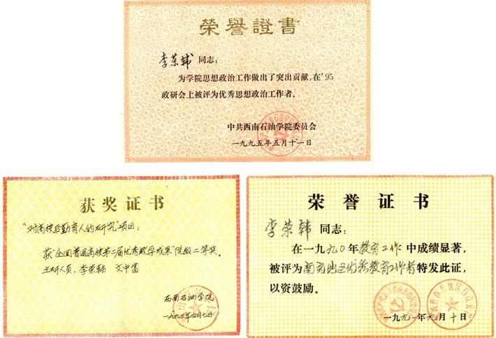 李榮韓,男,中共黨員,副教授,1939年12月出生,四川安岳人。1959年考入四川石油學院地質專業,1960年8月加入中國共產黨,畢業后留校任教,先后擔任輔導員、教師,從教二十余年,撰寫發表了數十篇論文。1987年,調到學校總務處工作,先后擔任總務處處長、總務處黨總支書記。多次獲得學校“優秀共產黨員”“先進工作者”“先進個人”和“優秀思想政治工作者”等榮譽稱號。退休后,擔任西南石油大學南充校區大學生德育督導員,繼續從事育人工作。2007年被教育部關心下一代工作委員會評為“先進個人”。