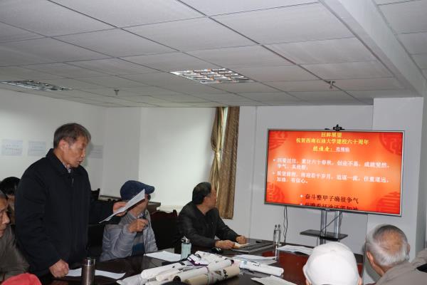 今年11月1日,學校將迎來60華誕。為隆重慶祝我校建校60周年,離退休工作處頤年詩書畫社的老同志通過詩歌朗誦、書畫攝影展覽、現場百米長卷書法等方式,既回憶了學校60年改革發展的崢嶸歲月,抒發了對學校濃烈的熱愛,表達了對學校誠摯的祝愿,又展現了西南石油大學離退休老同志的良好風采。