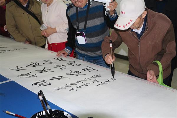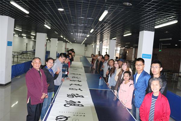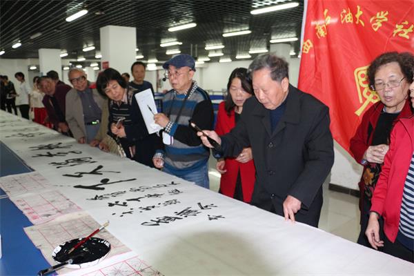 10月28日,頤年詩書畫社在藝術學院乒乓球活動室舉行了“慶校慶60周年現場百米長卷書法活動”。離退休老同志現場揮毫潑墨,或行書、或楷書、或草書,形式不拘一格,字體各有特色,書寫了對學校60年來改革發展取得成績的贊嘆,對學校雙一流學科建設和百年名校建設的信心,對祖國和學校越來越輝煌燦爛的祝愿。活動吸引了許多書法愛好者和師生,甚至還有許多留學生,其中7個不同國家的留學生合力書寫的“我為祖國獻石油”七個大字,更是贏得了熱烈的掌聲。百米書畫作品完成后,將交學校永久保存。