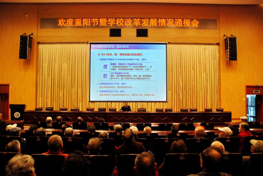 10月27日下午,學校召開歡度重陽節暨學校改革發展情況通報會,校黨委書記孫一平通報了學校一年來的改革發展情況。成都校區離退休同志參加了會議,南充校區離退休同志通過視頻觀看了會議。