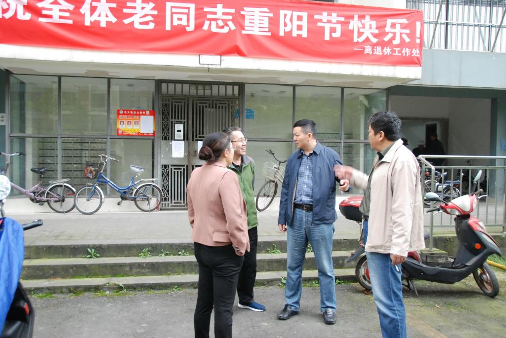 在離退休工作處負(fù)責(zé)人陪同下,周茂副校長和彭尚源考察了成都校區(qū)離退休工作處辦公、活動用房和家具配置情況,了解了門球場的家具設(shè)備配置和使用情況,饒有興致地參觀了離退休人員慶祝重陽詩書畫作品展,對作品所展示出的離退休人員不懈的精神追求和較高的藝術(shù)造詣贊嘆不已。