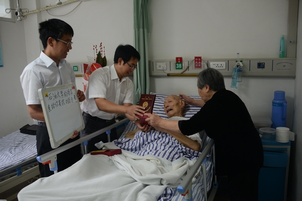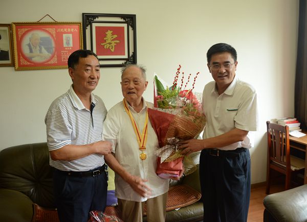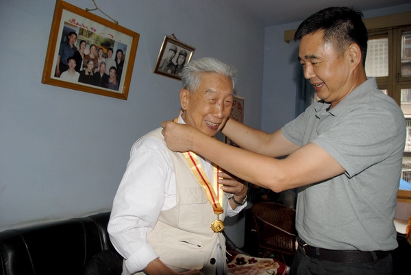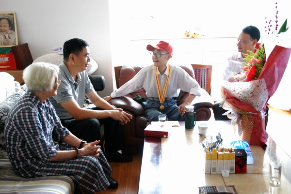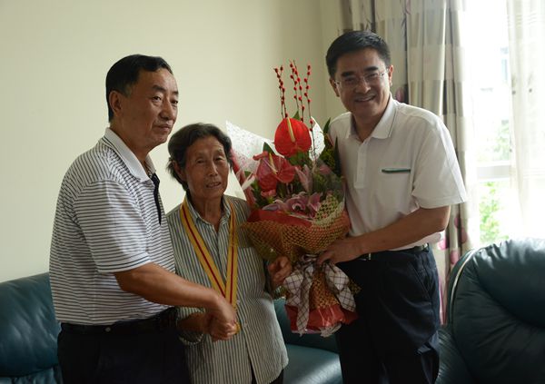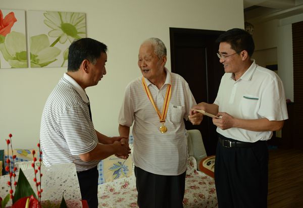 9月2日,校領導孫一平、趙金洲、張文衛、趙正文登門看望慰問了我校老紅軍楊天貴和抗戰時期參加革命工作的老干部張九山、呂竟成、楊林彬、吳業成、周志華,詢問他們的身體情況和家庭生活情況,向他們頒發抗日戰爭勝利70周年紀念章,送上慰問金、慰問品,并向他們致以崇高敬意和誠摯問候。黨辦校辦、離退休工作處負責人一同前往看望慰問。 在中國人民抗日戰爭暨世界反法西斯戰爭勝利70周年之際,中央決定,以中共中央、國務院、中央軍委名義,向約21萬名抗戰老戰士老同志、抗戰將領或其遺屬頒發中國人民抗日戰爭勝利70周年紀念章,表彰他們的歷史功勛,彰顯他們的榮譽地位,體現了對抗戰英雄的深切關懷和崇高敬意,體現了對歷史的銘記和對偉大抗戰精神的弘揚。 紀念章正面鑄有抗日戰士浮雕、延安寶塔山、黃河、橄欖枝、光芒圖案,寓意以愛國主義為核心的偉大民族精神是中國人民抗日戰爭勝利的決定因素,中國共產黨的中流砥柱作用是抗戰勝利的關鍵,全民族抗戰是抗戰勝利的重要法寶,頌揚抗戰老戰士老同志和抗戰將領對中國人民抗日戰爭暨世界反法西斯戰爭勝利作出的歷史貢獻,展現實現中華民族偉大復興的中國夢和世界和平發展的光明前景。