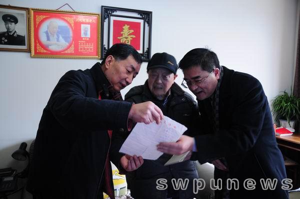 老紅軍楊天貴給孫一平、趙金洲看自己抄錄的文字