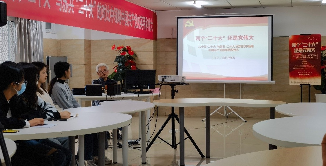 徐紀律教授以《兩個二十大 還是黨偉大 ——從中共二十大與蘇共二十大的對比中領略中國共產黨的英明和偉大》為題,從總結過去五年的工作和新時代十年的偉大變革、提出實現“第二個百年奮斗目標”的新任務、“兩步走”戰略安排、對當代中國青年寄予厚望四個方面宣講黨的二十大精神。他表示,中國共產黨第二十次全國代表大會勝利召開,在實現第一個百年奮斗目標的基礎上,吹響了全面建設社會主義現代化國家、實現第二個百年奮斗目標的進軍號。