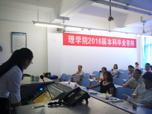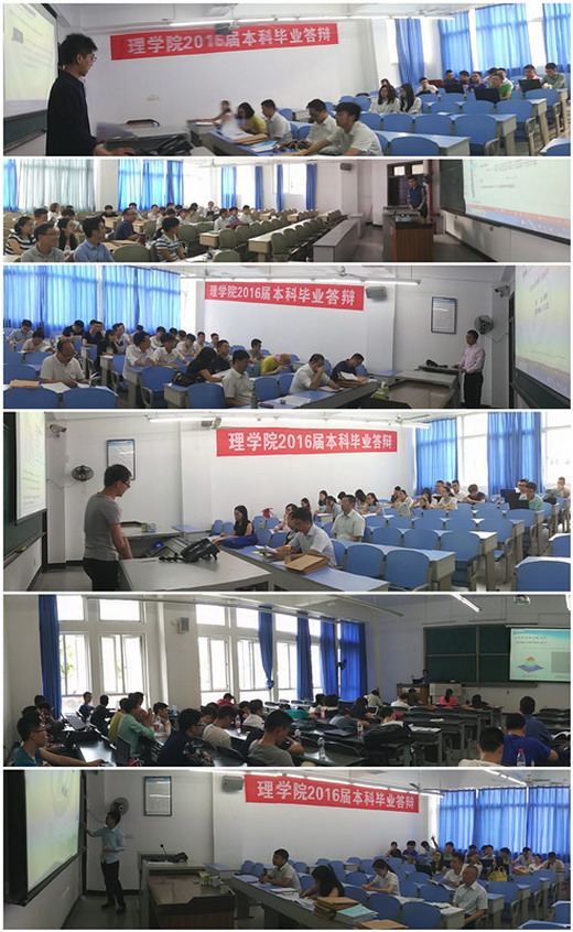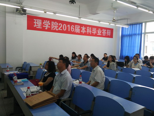 6月11日、12日,理學院2016屆本科畢業(yè)設計(論文)答辯有序進行,學院2012級數(shù)學與應用數(shù)學、信息與計算科學、應用物理和電子信息科學與技術四個專業(yè)共222名畢業(yè)生參與答辯。答辯分為9組,每組評審委員會由至少5名教師組成,老師們認真聽取學生的匯報,并對每位學生畢業(yè)設計(論文)中的亮點或不足進行記錄。學校主管教學副校長王玲、教務處處長黃健全、學校督導專家、我院黨政領導和教學督導專家對畢業(yè)答辯情況進行了檢查。