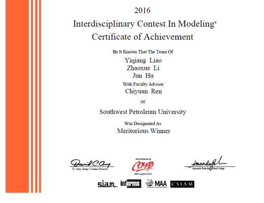 近日,美國大學生數學建模競賽官網上公布了2016年美國大學生數學建模競賽的評審結果,我校組織的5支參賽隊喜獲2個一等獎(Meritorious)、2個二等獎(Honorable Mention)和1個三等獎(Successful Participants),獲獎隊員主要來自理學院、石工院、土木工程與建筑學院,指導老師是理學院田東紅、金檢華、任馳遠、周彬四位老師。其中獲得一等獎的分別是趙俊炎、王遲蕾、彭勇、廖義強、李兆雪、胡軍六位同學。