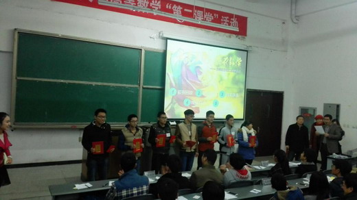 第三局是搶答賽,這才是體現同學們思維火花在頭腦中閃現的速度的時候了,當主持人問出一個問題后,幾秒鐘的時間就有同學舉手并且清晰地說出解答思路。第四局,比賽的最后一局“風險闖關”,顧名思義這一局比賽肯定不那么容易,每關試題難度不斷加大,同學們想要得分只能在此“背水一戰”。如履薄冰的選擇與激烈的角逐之后,活動已接近尾聲,同學們的得分也相繼得出,最后嘉賓為獲獎的同學頒獎并留影。這次活動雖然已結束,但比賽激烈的現場仍如在眼前。然而友誼第一、比賽第二,更重要的是我們要從活動中找到學習上的不足,不斷提升自己,讓自己在以后的比賽中大放光彩。