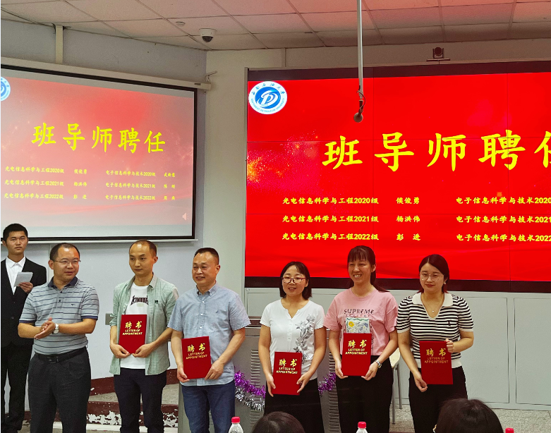 李玲娜、稅正偉、唐珊、侯俊勇分別為光電信息科學與工程2023屆深造學子佩戴紅花,號召學院學生以他們為榜樣,深耕專業領域,提早制定考研計劃。