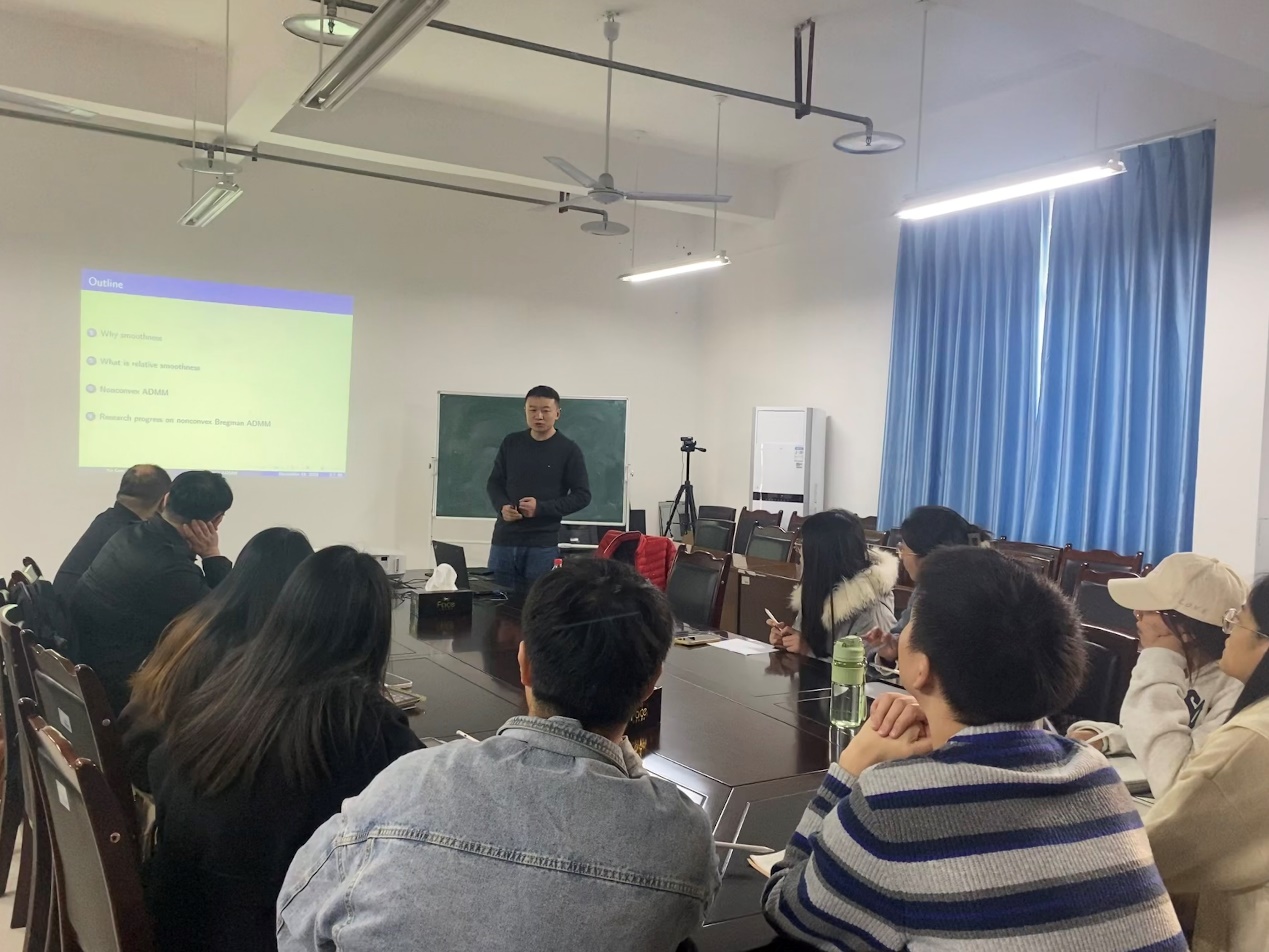 郭科老師從Oracle的概念入手,回顧了光滑性在優化算法中的重要作用,介紹了由此產生的相對光滑概念,然后對非凸優化問題的ADMM算法引入Bregeman度量,在相對光滑的條件下給出了算法框架并利用K-L不等式證明了該算法的收斂性。他強調了科研工作中對論文的深入閱讀和理解的重要性,鼓勵在場的師生們要勇于思考和提問,通過多角度、多層次的思考,為學術研究注入新的活力和創新思維。