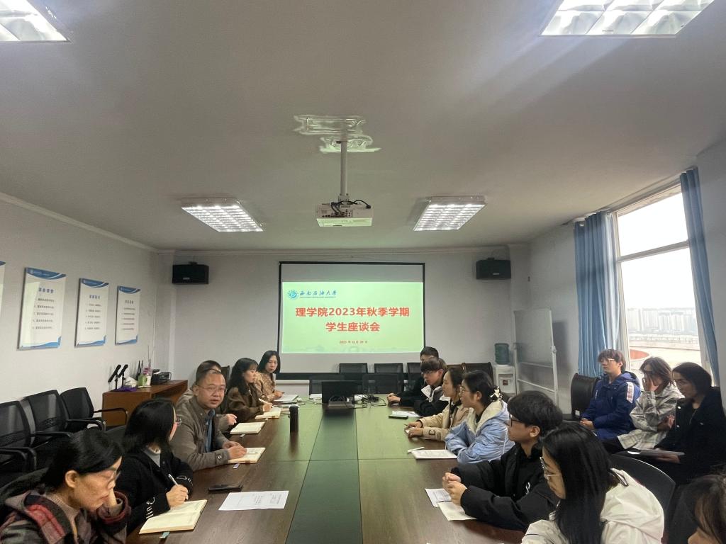 11月29日中午,理學院在南充校區完井樓501室舉行了2023年秋季學期期中學生座談會。理學院南充校區各教研室主任、輔導員、辦公室人員和學生代表參加了座談會,會議由副院長稅正偉主持。