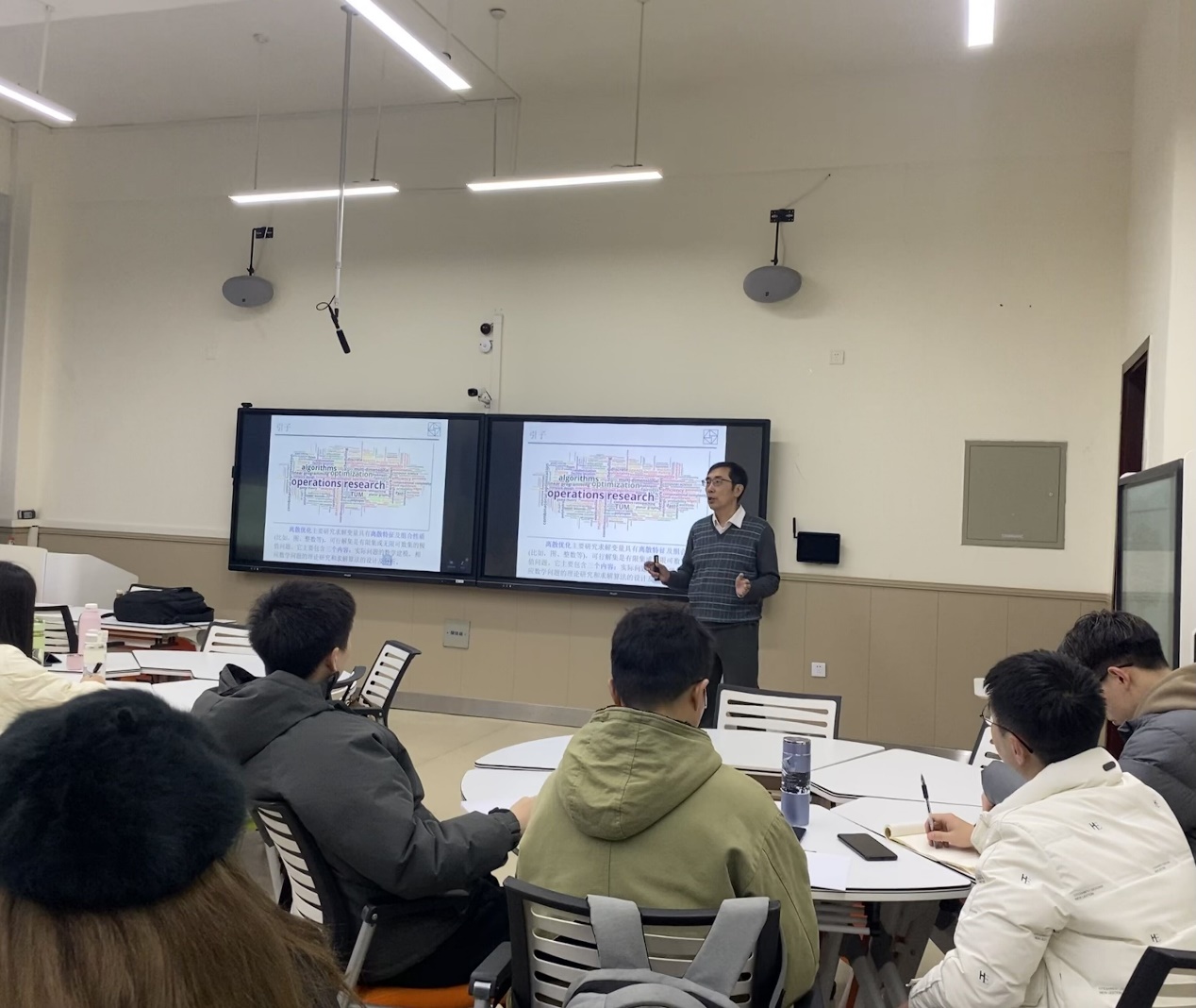 報(bào)告會(huì)結(jié)束后,胡老師與在場(chǎng)師生進(jìn)行了深入的討論交流,主要涉及NP難問(wèn)題以及離散優(yōu)化各類(lèi)模型在實(shí)際生產(chǎn)和生活中的應(yīng)用。同學(xué)們紛紛表示,通過(guò)本次報(bào)告,他們對(duì)離散優(yōu)化有了更加深刻的認(rèn)識(shí),并受益匪淺。