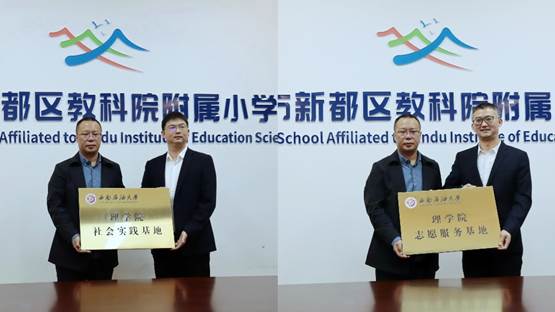 3月27日,理學院黨委副書記王茂江、副院長閔超、團委書記伍悅、輔導員李夢一行赴成都市新都區教科院附屬小學走訪交流,并舉行“理學院社會實踐基地”、“理學院志愿服務基地” 授牌儀式。活動由新都教科院副院長、新都教科院附屬小學黨支部書記、校長王英豪主持,附屬小學副書記劉紅群、綜合辦公室主任吳克娜、拓展課程部馬悅老師等參加了活動。
