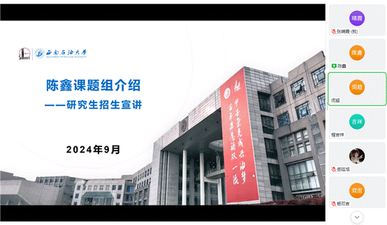 9月20日,“理學(xué)院2025年研究生招生宣講會(huì)(第5期)”在線舉行。本次宣講會(huì)非常榮幸地邀請(qǐng)到化學(xué)化工學(xué)院的陳鑫教授團(tuán)隊(duì)和機(jī)電工程學(xué)院葛亮教授團(tuán)隊(duì)與我院廣大師生進(jìn)行交流,會(huì)議由理學(xué)院副院長(zhǎng)閔超教授主持,理學(xué)院南充校區(qū)光電信息工程、電信科技等專業(yè)的本科生和相關(guān)方向的教師參加了本次宣講會(huì)。