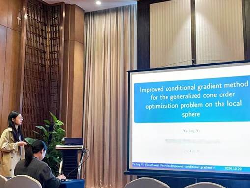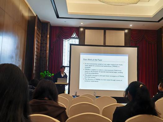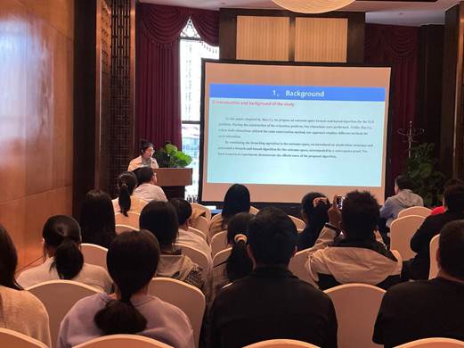 會議期間,我院研究生參與了多場分組報告,唐敏、易亞玲、梅寒冰、易小林、文鵬飛等人分別以球面廣義錐序關系下的像空間分析理論和算法、線性比式和的輸出空間分支定界算法、基于演化博弈的國家通用語言文字推廣模型和無約束優化問題的非單調自適應信賴域算法為主題進行了匯報和交流。聽取報告之后,各位參與者對各算法的創新點表現出濃厚的興趣,積極提問,并深入探討了理論優勢與迭代次數的實際表現。大家尤其對球面上錐序關系的建立表現出極大興趣,并討論了縮小錐的范圍算法的可行性。在算法的應用層面,大家積極交流了該理論在機器學習、信號處理和數據分析中的潛在價值。此外,關于第二次松弛的理論作用,引發了熱烈的討論,現場氣氛十分活躍。值得一提的是,匯報時研究生梅寒冰有幸遇到了論文中引用文獻之一的作者張博老師,雙方對相關研究方向進行了深入探討。張博老師對其匯報提出了寶貴的建議,幫助她對研究內容有了更深的認識。