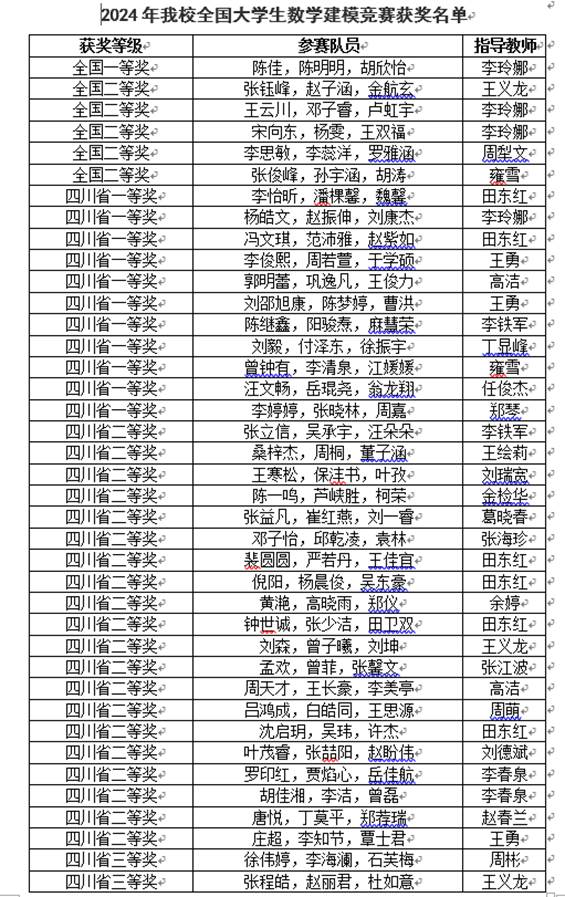 近日,全國大學生數學建模競賽組委會公布了2024高教社杯全國大學生數學建模競賽獲獎名單,我校共有6支參賽隊伍獲得全國獎,其中由理學院李玲娜教授指導的參賽隊(學生:理學院陳佳、胡欣怡,計軟院陳明明)榮獲全國一等獎,另外5支隊伍獲得全國二等獎。此外,我校還有11支參賽隊伍獲得四川省一等獎,20支參賽隊伍獲得四川省二等獎,2支參賽隊伍獲得四川省三等獎。