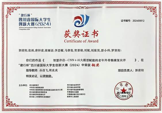 近日,四川省教育廳公布了“建行杯”四川省國際大學生創(chuàng)新大賽(2024)的獲獎名單,理學院人工智能專業(yè)郭清陽同學牽頭的參賽團隊以“智慧伴侶-CNN+AI大模型賦能的老年外骨骼康復伙伴”項目斬獲銅獎。