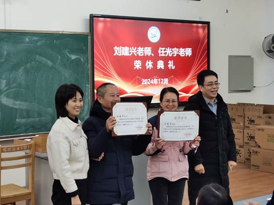 李玲娜副院長首先宣讀了劉建興、任光宇兩位老師的榮休敬辭,楊雁書記、宋國杰院長分別為兩位老教師頒發了榮休證書,新教師代表彭一、羅海夢為他們敬獻了鮮花。