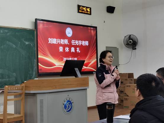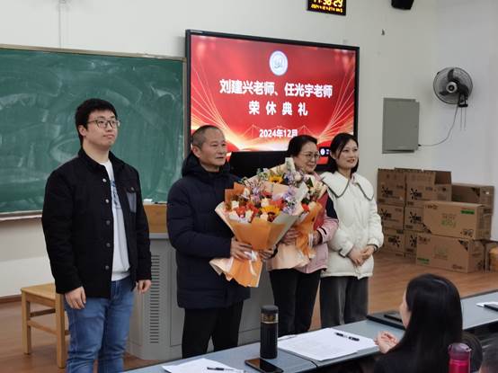 12月27日下午,理學院在明理樓A101教室召開教職工大會,為學院劉建興、任光宇兩位老師舉行榮休儀式。會議由學院黨委書記楊雁主持。