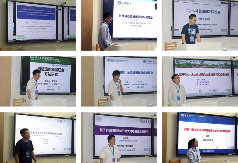 分享階段,來自南洋理工大學(xué)數(shù)學(xué)系童平研究員,電子科技大學(xué)方志龍研究員,國家級(jí)青年人才、應(yīng)急管理部國家自然災(zāi)害防治研究院劉少林研究員,中山大學(xué)黃建東副教授,應(yīng)急管理部國家自然災(zāi)害防治研究院李孟洋助理研究員,清華大學(xué)丘成桐數(shù)學(xué)科學(xué)中心溫瑨博士后,清華大學(xué)數(shù)學(xué)系王永斐博士后,我校地球科學(xué)與技術(shù)學(xué)院陳小春老師,我院青年教師黃蓉等九位主講人圍繞計(jì)算地球物理相關(guān)前沿方法和應(yīng)用闡述了各自最新的科研成果。內(nèi)容豐富多元,引發(fā)了大家的熱烈討論。
