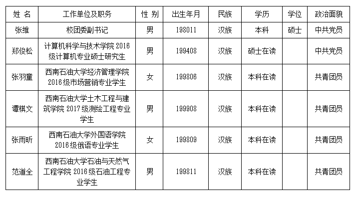 公示時間為 2018年 8月28日—9月3日(共5個工作日)。公示期內,團員青年如發(fā)現候選人預備人選在德、能、勤、績、廉等方面存在問題,請以真實姓名,當面或用信函、電話向共青團西南石油大學委員會反映。