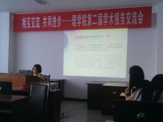 2013級九名研究生分別為大家分享了課題研究重心及創(chuàng)新點,演講更加具有濃厚的學術(shù)氣息、知識面更廣。孫娟同學為大家?guī)怼稊?shù)據(jù)處理與數(shù)學建模方法》的報告,呂曉霞同學和張林同學從相關(guān)概念入手為大家介紹了模糊數(shù)學的理論知識,使在座的同學對模糊數(shù)學有了更深一步的了解,接下來的同學也為大家?guī)砭始姵实膱蟾妗?/p>