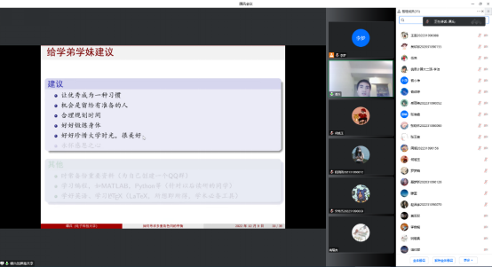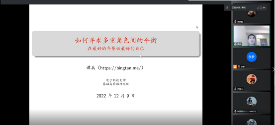 2022年12月9日13時(shí)30分,理學(xué)院通過(guò)騰訊會(huì)議線上開(kāi)展了“青馬工程”主題團(tuán)課第二講,理學(xué)院2018屆優(yōu)秀畢業(yè)生,現(xiàn)電子科技大學(xué)基礎(chǔ)與前沿研究院學(xué)生譚兵學(xué)長(zhǎng)為青馬工程培訓(xùn)班全體學(xué)員做了題為“大學(xué)生如何尋求多種角色間的平衡——在最好的年華做最好的自己”的專(zhuān)題講座,培訓(xùn)班全體學(xué)員參加,本次講座由2020級(jí)輔導(dǎo)員李夢(mèng)主持。