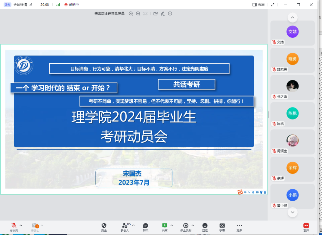隨著社會的不斷發展和進步,考研已經成為許多大學畢業生繼續深造的首選,為了提升2024屆同學的考研復習效率,明確考研目標,7月12日下午15時,理學院在飛書平臺線上召開了2024屆畢業生考研報考和復習方法專題講座,講座由理學院院長宋國杰主講。