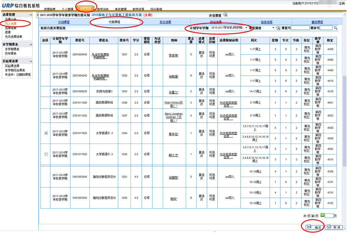 2、正選依次點(diǎn)擊導(dǎo)航條中的【選課管理】→【網(wǎng)上選課】,選擇培養(yǎng)方案,進(jìn)入“方案課程”選課頁面,在“計劃學(xué)年學(xué)期”下拉列表框中選擇“2018-2019學(xué)年秋”,根據(jù)所顯示的課程名和課序號,對照《2018年秋季學(xué)期2018級新生選課表》(見附件1)中所列課程,選擇本專業(yè)教學(xué)計劃規(guī)定的相應(yīng)課程,然后單擊【確定】即可。(也可直接在“課程號”和“課序號”中,輸入課程號和課序號過濾出欲選擇的課程。注意,每一個課程號代表一門課程,每一個課序號代表一個教學(xué)班,同一課程號的不同課序號代表同一門課程有多個教學(xué)班,在選課時,一門課程只能選一個課序號)