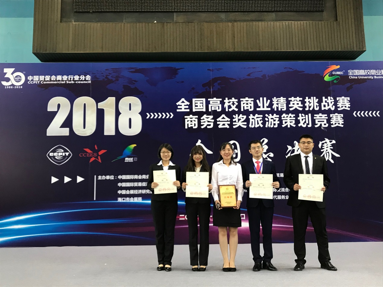 10月27日,2018年全國高校商業精英挑戰賽商務會獎旅游策劃競賽全國總決賽在??谡铰湎箩∧唬斀泴W院學生王競樂、熊玉萍、熊超、劉庭組成的“乘風破浪隊”作為西南石油大學代表隊赴海口參賽。在肖怡然和張艷萍老師的指導下下,經過激烈角逐,獲得全國總決賽二等獎和展治會環節一等獎。