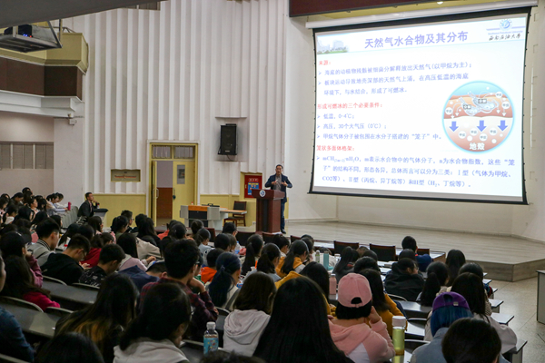 講座中,毛金成教授從我國天然氣水合物及其分布、天然氣水合物開采方式和天然氣水合物研究開發進展幾個方面作了重點闡述。毛教授介紹了天然氣水合物的化學形成原理,通過動畫模擬還原了天然氣水合物現場開采的場景。他說,我校著名校友、中國工程院院士周守為提出了固態流化開采法這一全新開采模式,為我國天然氣水合物開采研究作出了突出貢獻。