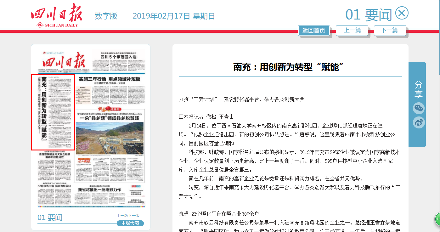 2月17日,四川日報以《南充:用創新為轉型“賦能”》為題,在頭版頭條重點報道國家大學科技園南充分園發揮學校科技、人才和平臺等優勢,向南充市創客提供“創業苗圃+孵化器+加速器+產業園”的“保姆式”服務,為南充創新驅動增添了新動能。