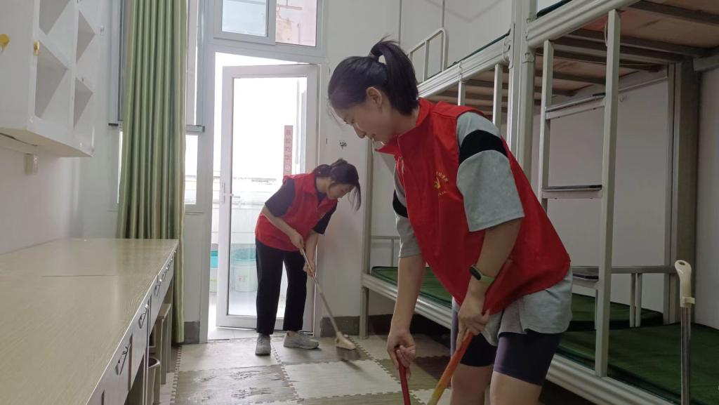 財經學院學生第一黨支部黨員協助后勤打掃畢業生寢室
