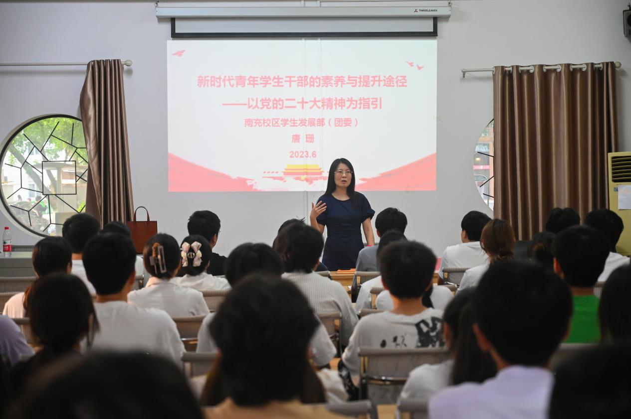 6月9日晚,南充校區學生發展部(團委)副部長唐珊講授了學習貫徹習近平新時代中國特色社會主義思想主題教育專題黨課。此次黨課主題為《新時代青年學生干部的素養與提升——以黨的二十大精神為指引》。南充校區80余名團學骨干聆聽了黨課。