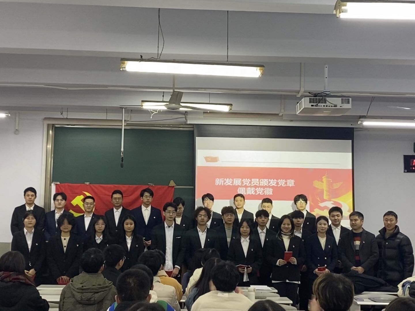 蔡燦宣讀了《關(guān)于機電工程學(xué)院2023年秋季發(fā)展新黨員的批復(fù)》,并為23名預(yù)備黨員佩戴了黨徽,頒發(fā)了黨章,為轉(zhuǎn)正黨員送上了政治生日賀卡。他表示,學(xué)生黨員是黨和國家的希望和未來,要主動承擔(dān)起時代賦予的重任,堅守初心使命,從偉大建黨精神中賡續(xù)共產(chǎn)黨人的精神血脈。希望全體黨員同志既要注重理論知識的學(xué)習(xí),又要加強專業(yè)課程的學(xué)習(xí),努力成為懷抱夢想又腳踏實地,敢想敢為又善作善成的新時代青年大學(xué)生,讓青春在全面建設(shè)社會主義現(xiàn)代化國家的火熱實踐中綻放絢麗之花。