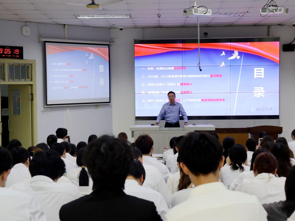 4月22日,學校黨校第276期發展對象培訓班第三次專題黨課在第四教學樓4316教室舉行。駐校紀檢監察組副組長、校紀委副書記、南充校區黨委副書記、紀委書記范起東帶領第276期發展對象培訓班全體成員對《中國共產黨紀律處分條例》(以下簡稱《條例》)進行學習解讀。