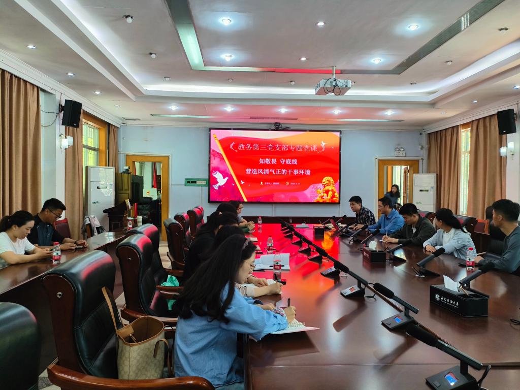 4月17日上午,南充校區(qū)副校長諶貴輝為教務(wù)部第三黨支部全體黨員講授專題黨課。本次黨課以《知敬畏、守底線,營造風(fēng)清氣正的干事環(huán)境》為主題,圍繞全面從嚴(yán)治黨新要求,通過理論闡釋、案例剖析與實(shí)踐指導(dǎo)相結(jié)合的方式,為黨員上了一堂深刻的思想教育課。