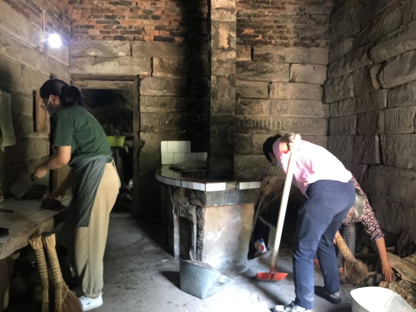 黨員同志幫助脫貧戶安裝鐵鍬等農具場景