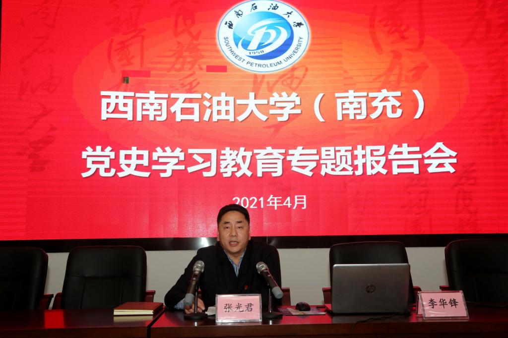 為推動(dòng)黨史學(xué)習(xí)教育進(jìn)一步在校區(qū)走深走實(shí),4月22日下午,南充校區(qū)在國際學(xué)術(shù)交流中心舉行黨史學(xué)習(xí)教育專題報(bào)告會(huì)。校長助理、南充校區(qū)黨委常務(wù)副書記張光君主持會(huì)議并講話。基礎(chǔ)教學(xué)部馬克思主義教研室主任李華鋒在會(huì)上作題為“中國共產(chǎn)黨取得巨大成功的原因解讀”專題輔導(dǎo)報(bào)告。校區(qū)領(lǐng)導(dǎo)、黨建聯(lián)學(xué)聯(lián)建單位(順慶區(qū)舞鳳街道黨工委)同志和校區(qū)全體黨員聆聽了報(bào)告。