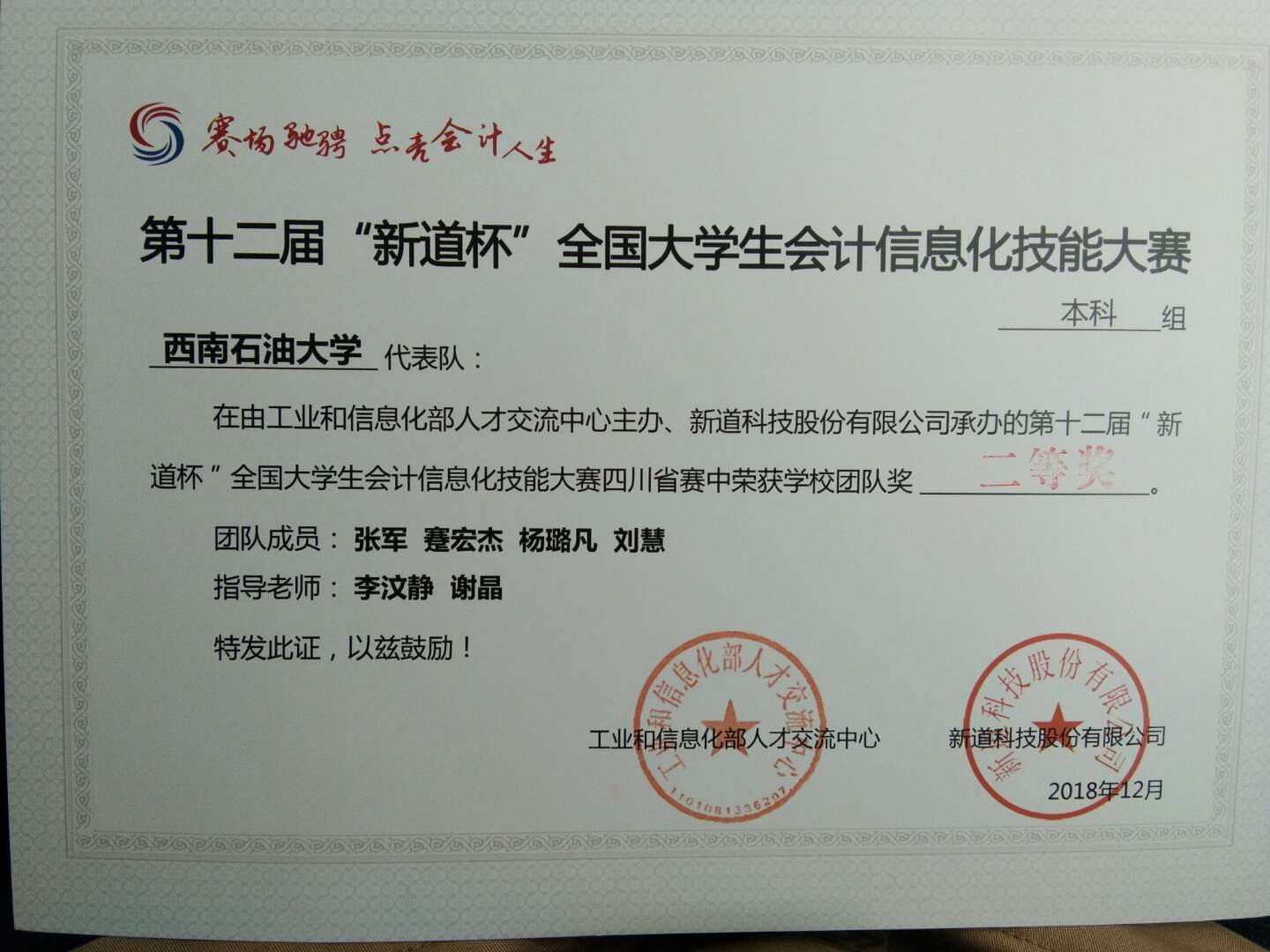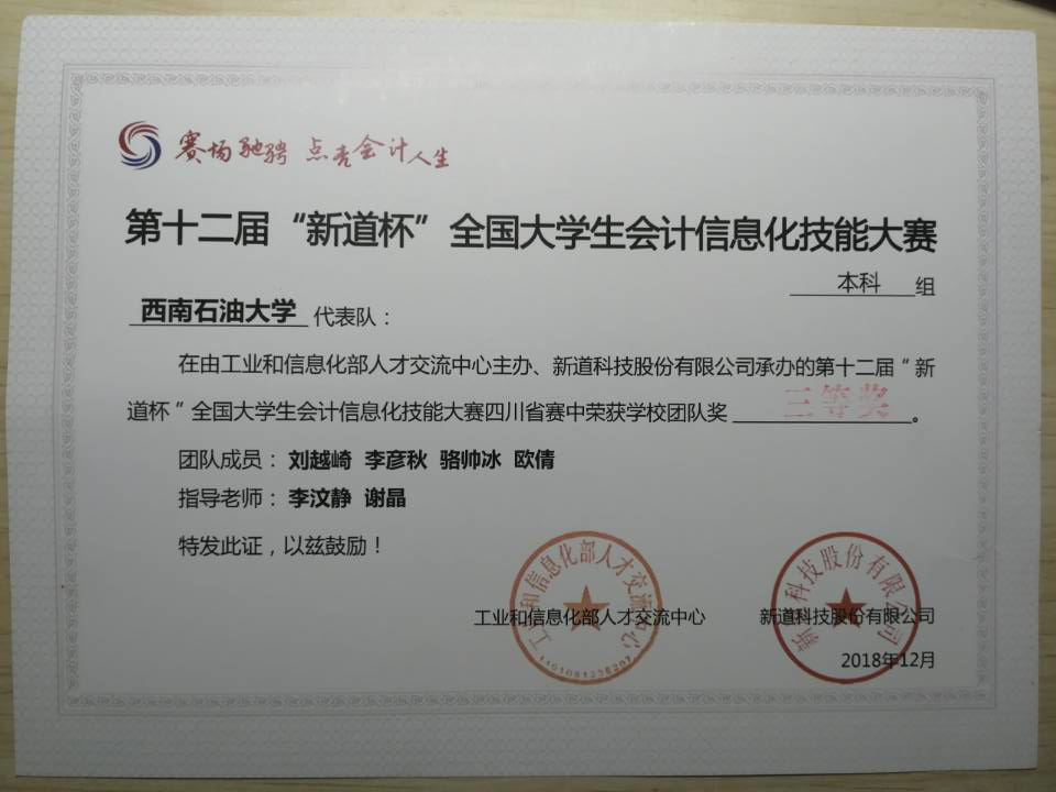 12月15日,第十二屆“新道杯”全國大學生會計信息化技能大賽四川省賽在成都舉行,來自西南科技大學,西華大學,四川工商學院等25所高校參加了比賽。財務管理專業學生張軍、蹇宏杰、楊璐凡、劉慧組成的隊伍榮獲二等獎,駱帥冰、歐倩、李彥秋、劉越崎組成的隊伍榮獲三等獎,指導教師李汶靜、謝晶獲優秀指導教師。