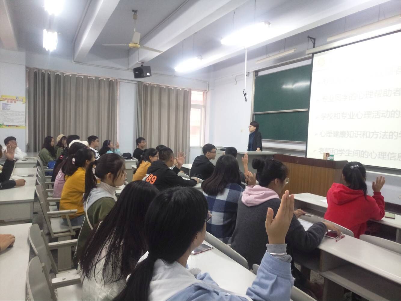 下午4點半,2018級各專業心理委員在4205教室參加了第二批次心理委員培訓:如何做一名合格的觀察者。首先,吳靜老師歡迎各位新同學加入心理委員這個大家庭,從對心理委員的角色、職責、定位三個方面進行闡述,讓各位心理委員感受到了自己肩上的責任和義務,明確了今后工作的方向,肯定了心理委員在班級建設中的重要作用。其次,吳老師分享了關于大學生的心理健康知識,尤其是對于可能處于危機當中的同學的識別和幫助,進一步豐富了心理委員們的心理知識,有助于他們日常工作的開展。最后,吳老師對2018級心理委員及班導生進開展了一次以積極融入大家庭為主體的團體輔導,通過“大風吹”、“五毛一塊”、“棒打薄情郎”、“心有千千結”等活動使同學們進一步地認識自我、了解彼此,增強了心理委員群體的凝聚力,也為他們提供了一個展示自己的平臺。培訓過程中,同學們團結協作,在輕松快樂的氛圍中加深了彼此之間的了解,感受到了團體的溫暖,學會了在集體生活中相互支持、相互理解、相互信任。活動中,吳老師向同學們介紹了各個活動需要準備的物品、在做每個活動時的注意事項以及如何分享團體成員感悟的方法。